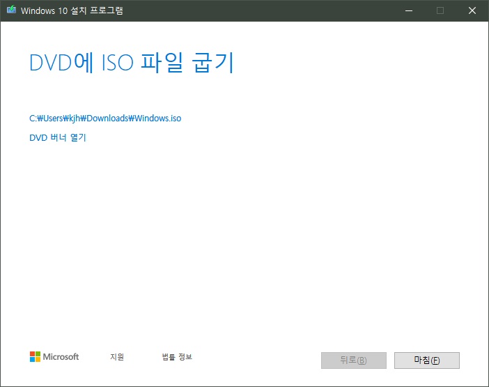 Windows 10용 ISO 파일을 다운로드한 경우, 해당 파일은 선택한 위치에 로컬로 저장됩니다.컴퓨터에 타사 DVD 굽기 프로그램이 설치되어 있으며 해당 프로그램을 사용하여 설치 DVD를 만들려는 경우, 파일이 저장된 위치로 이동하여 ISO 파일을 두 번 클릭하거나 마우스 오른쪽 단추를 클릭하고, 다른 프로그램으로 열기를 선택하여 선호하는 해당 DVD 굽기 소프트웨어를 선택하면 프로그램을 열 수 있습니다. Windows 디스크 이미지 버너를 사용하여