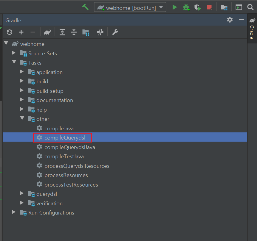 Gradle > Tasks > other 에 보면 compileQuerydsl 이 보입니다. 더블클릭하여 실행하면