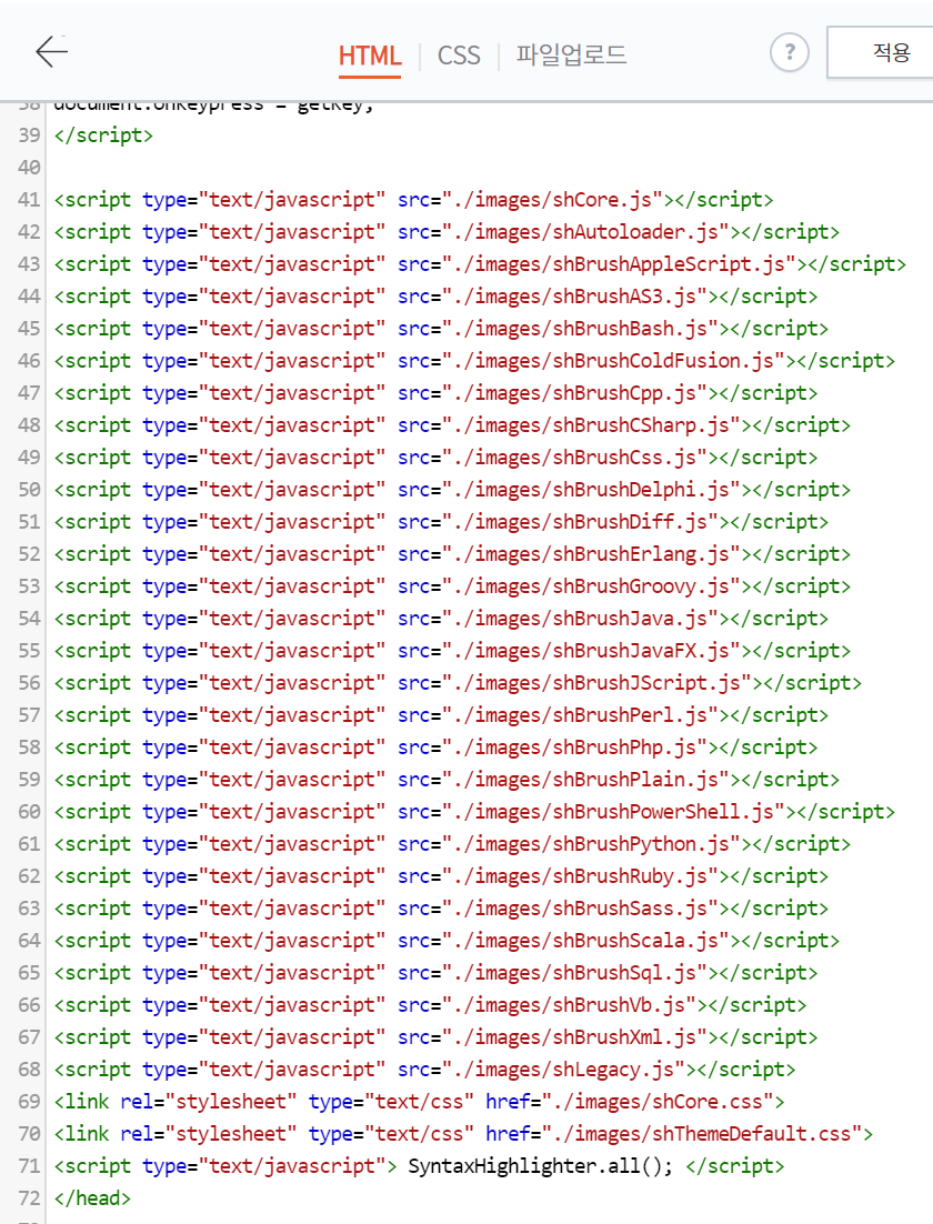 이상으로 syntaxhighlighter 적용 마무리입니다.